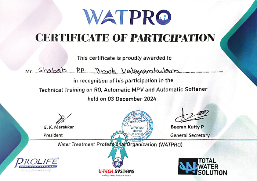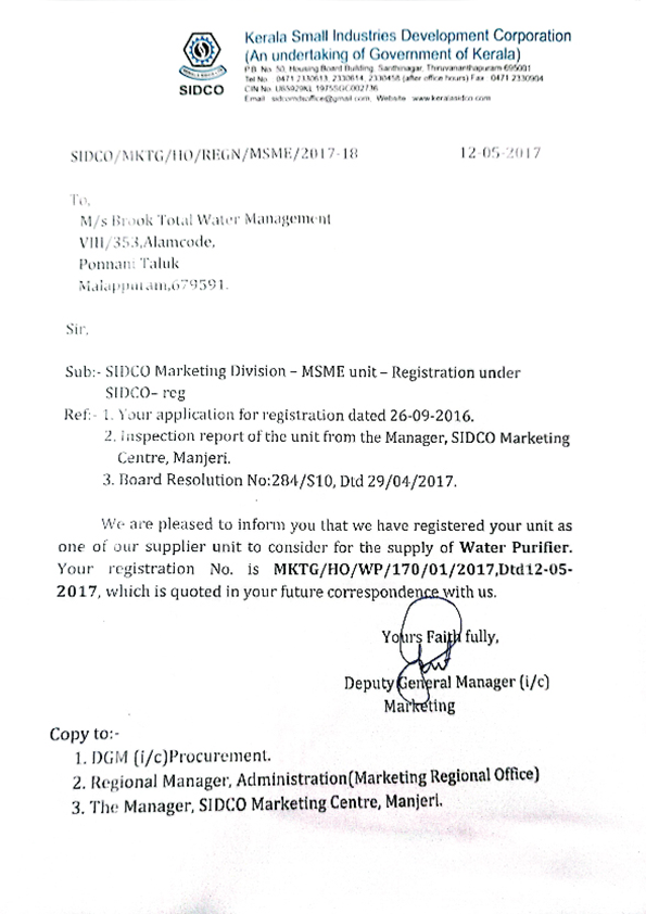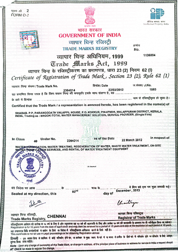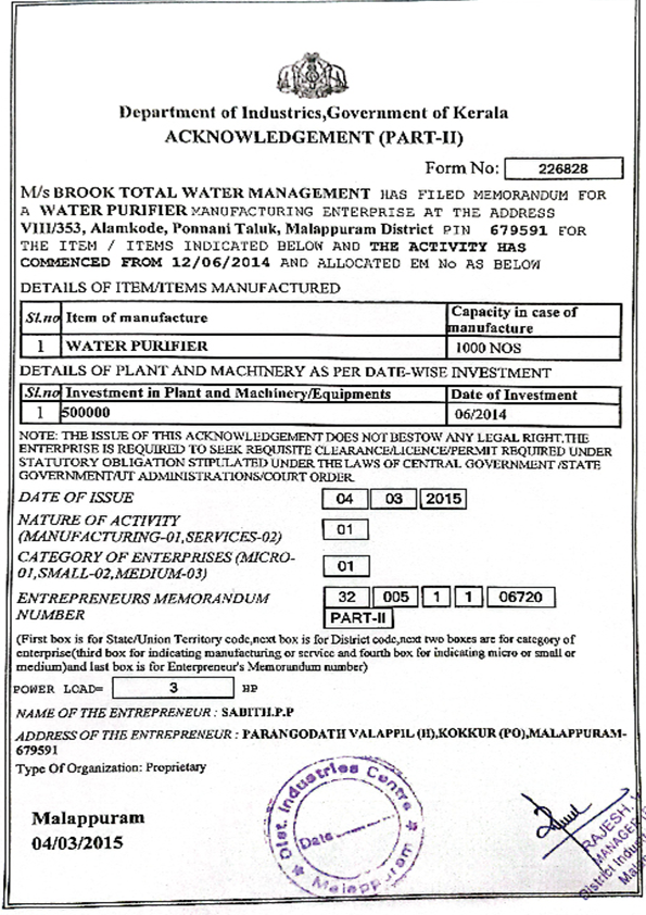 A company should be appraised not by the words it uses to speak of itself. We must have its achievements as the real touchstone. In 2012, the Brook Water Purifier was selected for the Kerala Entrepreneur Programming Award, which it received from Kerala Finance Minister KM Mani. Our Sagacious customers will attest to our words: we have served Brahmakumari Ashramam and VKC footware owner Muhammad Koya in Calicut; the Ayurvedha Medical College and Varkala Resorts in Thriuvananthapuram; and the Chavakkad Sea Water Project and the apartment of the owner of Kochi-based Oberon Mall in Trichur.